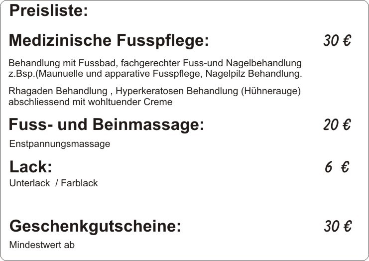 Werfen Sie einen Blick in mein Fußpflege-Studio und erfahren sie mehr über mich und mein umfassendes Angebot. Von der kosmetischen und medizinischen Fußpflege bis hin zu Massagen: